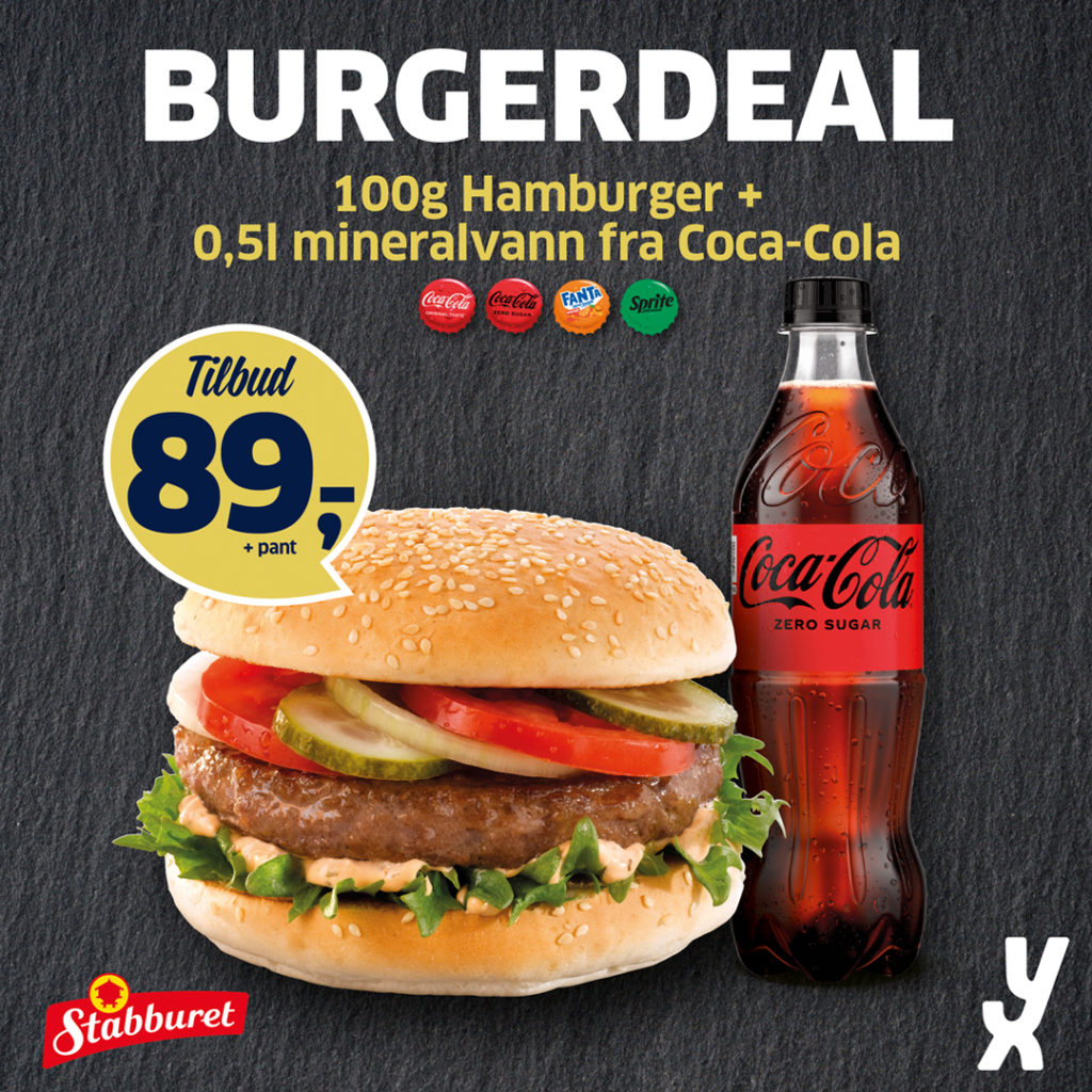 Burgerdeal! 100g Hamburger og 0.5l fra Coca-Cola: 89,- + pant