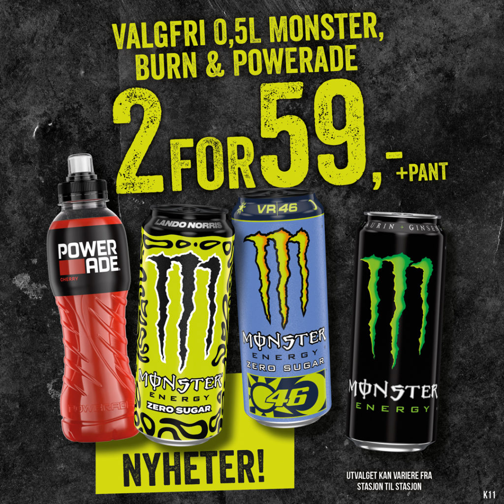 2 x 0.5L Monster, Burn og Powerade: 2 for 59,- + pant